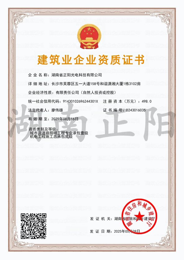 2025年5月28日,經(jīng)湖南省住房和城鄉(xiāng)建設(shè)廳審核批準(zhǔn),湖南省正陽(yáng)光電科技有限公司成功獲得“機(jī)電工程施工...